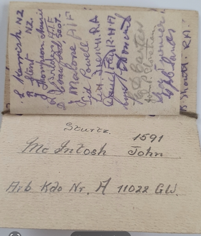 “In October, we moved our barracks from Glandorf to St. Veidt, and believe me it was a great improvement as we had new beds, stores, etc. to make us as comfortable as possible. Up to the present day of my writing this (December 17th, 1942), things are great as we have plenty of food (Thanks to the Red Cross) and the news of the war we get is well in our favour so we feel certain that the New Year will see us home. We are busy preparing for a Good Christmas, as we have all clubbed articles out of our parcels for the past month so as to have Big Eats over XMAS. We are also arranging a Concert, Games, etc., so as to make life as merry as possible.Well, it’s now January 1st today and I am going to describe how Christmas Eve and New Years were spent. On Dec. 23rd we got issued with a Red Cross XMAS Parcel which contained XMAS pudding, Xmas cake, chocolate biscuits, Milk, Sweets, Meat Pies, Chocolate, Cheese, Sugar, Steak and Tomatoes Pudding, Tea, Ovaltine, Jam, Butter.>